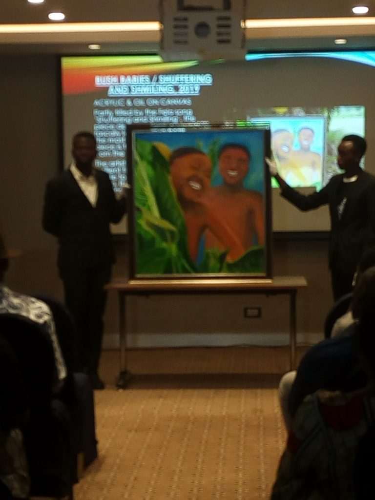 The painting titled ‘Bush Babies/Shuffering and Smiling’ is aptly named after a Fela Anikulapo-Kuti album with the same title.