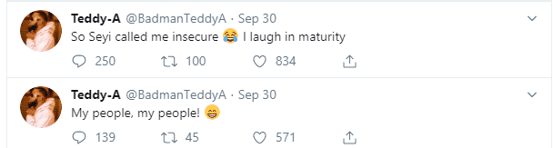 Reacting to being described as “insecure” by Seyi after they left the house, Teddy A tweeted: