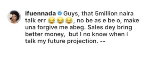 “Guys, that 5million naira talk err, no be as e be o, make una forgive me abeg. Sales dey bring better money, but I no know when I talk my future projection. –“