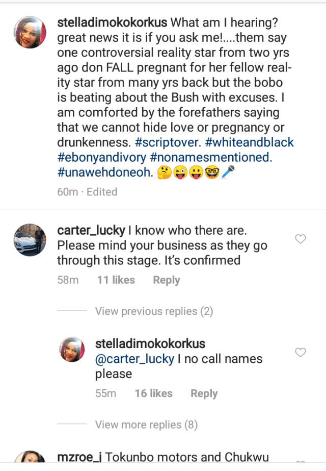Here’s the post; “What am I hearing?great news it is if you ask me!….them say one controversial reality star from two yrs ago don FALL pregnant for her fellow reality star from many yrs back but the bobo is beating about the Bush with excuses.”