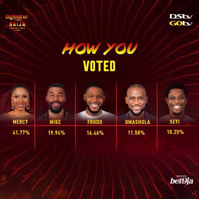MPmania reports that she polled 41.77% of votes against Mike’s 19.94%, Frodd’s 16.46%, Omashola’s 11.58% and Seyi Awolowo’s 10.25% as announced by BBnaija on twitter;