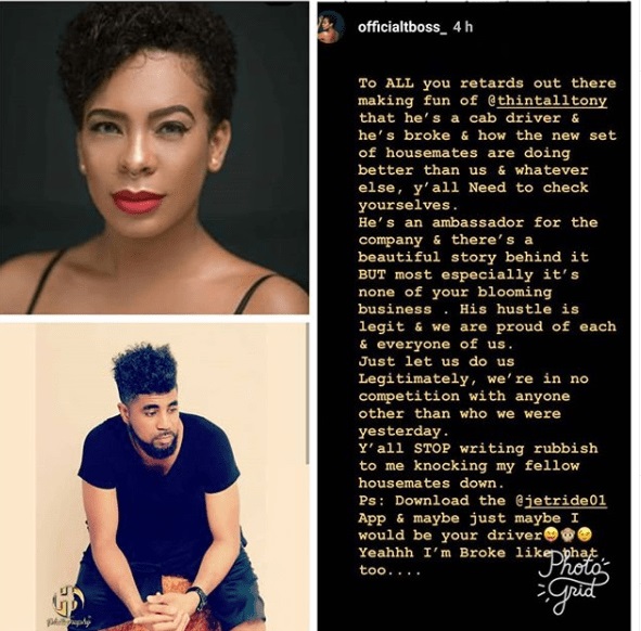 Ex-BBNaija housemate, TBoss has attacked Nigerians mocking his fellow housemate, Thin Tall Tony following revelations that he drives cab for a living.