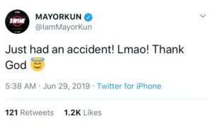 Nigerian singer, songwriter and pianist, Adewale Mayowa Emmanuel, known professionally as Mayorkun, shared a tweet early this morning about how he got involved in an accident.