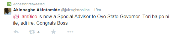 advisers..He just confirmed it by retweeting a tweet to that effect. 9ice has still been active on the political