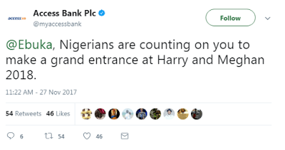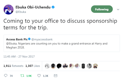 So, Access bank tweeted at Ebuka Obi-Uchendu about making a grand entrance to Prince Harry and Meghan Markle’s wedding.