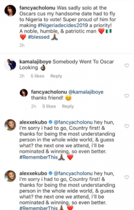 The international model said she had to go solo to the 91st Academy Awards because her actor boyfriend chose to fly back to Nigeria to vote in the general elections rather than attend the exclusive event.