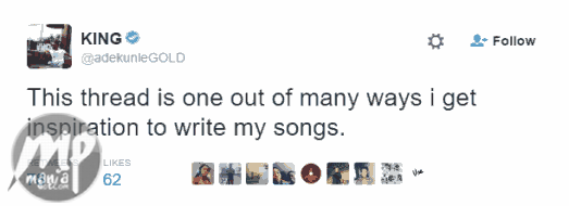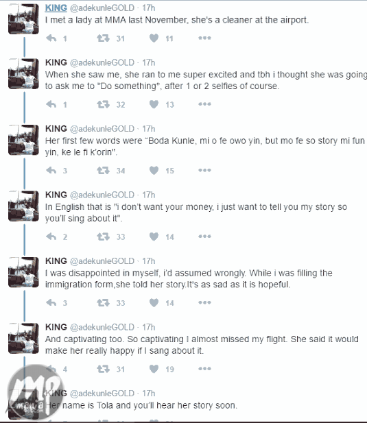 Singer, Adekunle Gold took to his twitter to narrate how a cleaner he met at Lagos airport inspired his music.