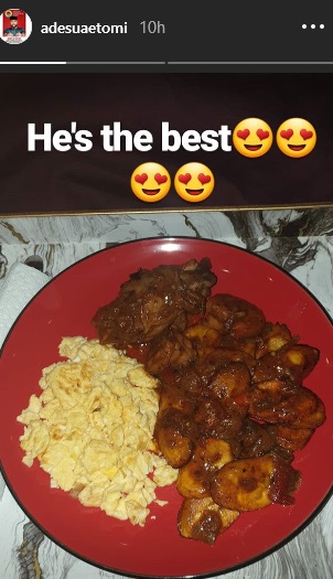 Popular singer, Banky W decided to give his wife, Adesua Etomi a great treat by cooking her a sumptuous meal. Adesua while sharing a photo of the meal was full of praise for her husband, describing him as the best.