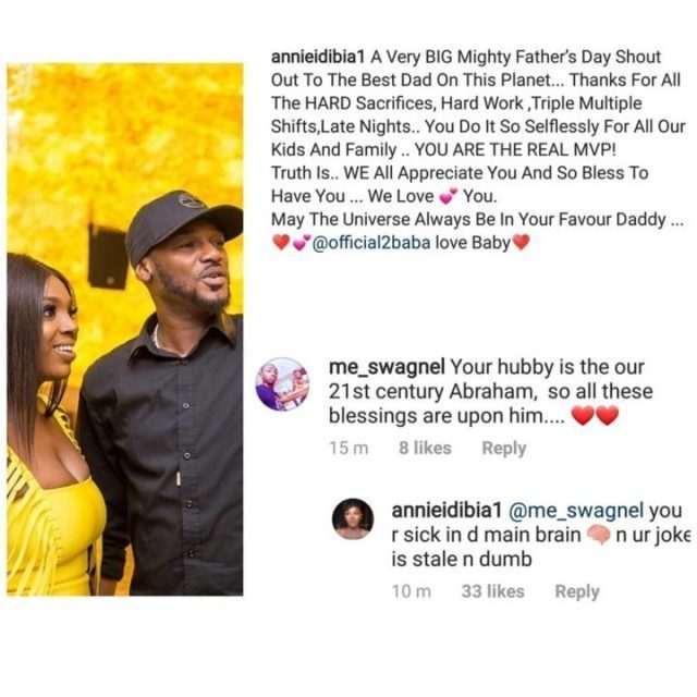 This happened after Annie posted a photo of herself and 2Baba, wishing him Happy father’s day on IG.