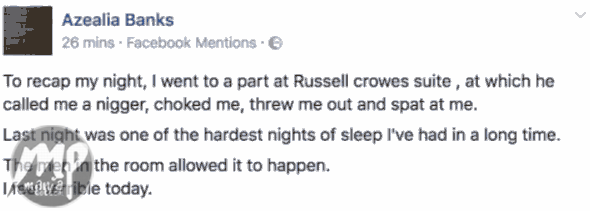 The controversial rapper, Azealia Banks took to Facebook to say she was assaulted by actor, Russell Crow at his hotel suite.