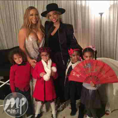 Queen Bey and her daughter took photos backstage with Mariah and her twins and another child. Hope seeing Blue Ivy play with Mariah’s kids won’t make Kanye angry again. Mariah shared the photo above and wrote: