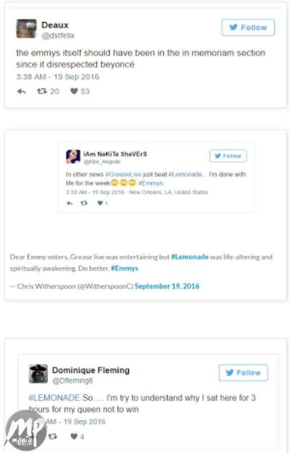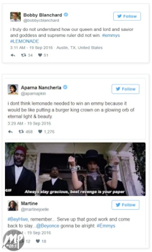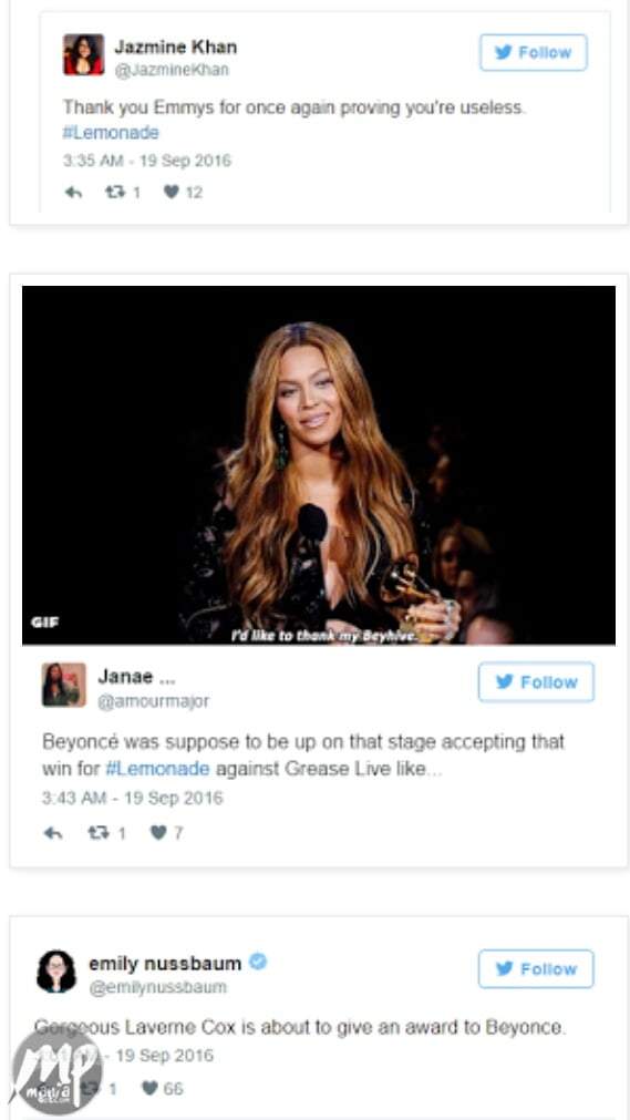 Beyonce fans vent anger on Twitter after LEMONADE failed to win at the Emmy’s