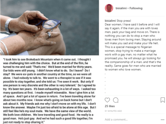This is a special message to Nigerian women, stop trying to make a marriage work with a gay man, no matter what he promised you, he will always go looking for the companionship of a man, and that’s the reality. Same goes for men who are married to women who love women.”
