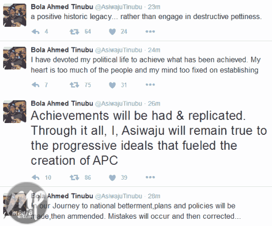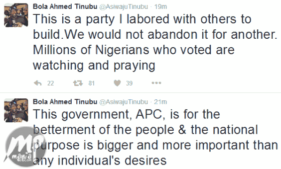 In a series of tweets, former Lagos state governor and National Leader of APC, Bola Tinubu, said APC is a party he labored with some other party members to build and will not be abandoning the party for others to control.