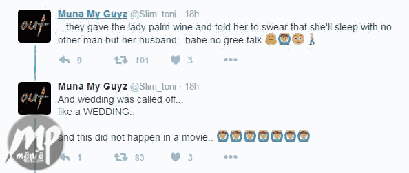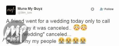 Twitter user, Muna shared the story on his timeline.According to him, a wedding was cancelled after the bride refused to swear not to have extramarital affairs. Date: 2016-12-18 Category: Gist & Gossip