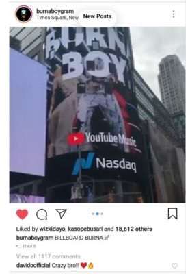 The all excited Burna Boy posted pictures and a video of the billboards showing his music video and pictures while using the caption “billboard Burna”. Other Nigerian artistes were proud of Burna Boy’s International recognition as pop-star Davido also went to his comment section.