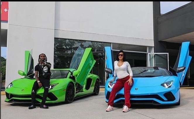 Celebrity Music couple, Cardi B and Offset welcomed their first child, a baby girl named Kulture Kiari Cephus earlier this month. In celebration of the birth of the child, Cardi and Offset decided to buy themselves matching Green and Blue Lamborghini cars.