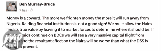 DSS officials in a bid to stop bureau de change operators from causing the free fall of the Naira, stormed some of their offices and arrested two operators who were selling dollar above N400. Senator Murray-Bruce feels this action is not a step in the right direction.