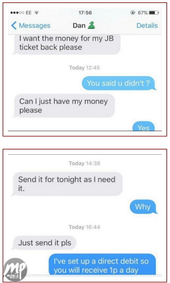 After their relationship packed up due his cheating, the boyfriend, Dan asked her to pay back the $17 ticket he bought for Justin Bieber’s concert.