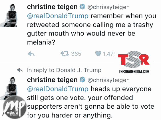 Who, by the way, is losing to Hilary Clinton, by 5 points in the polls.. Date: 2016-09-12 Category: Gist & Gossip Tags: Chrissy Teigen, Donald Trump