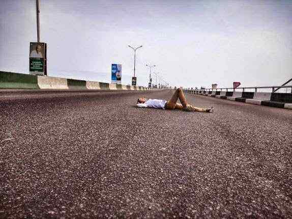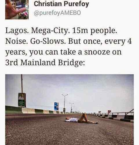CNN correspondent, Christian Purefoy was photographed having a nap on 3rd Mainland Bridge today, April 11, 2015.