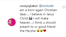 Nollywood actress and well… a general entertainer, Cossy Ojiakor minutes ago posted a video of herself twerking in red on Instagram and Tonto got under the comment section saying, she sees Cossy winning souls for Christ one day. Cossy who didn’t like that tone, quickly corrected her saying SHE IS A BORN AGAIN CHRISTIAN, and she will make Heaven, but she thinks Tonto should talk to her good friend the shemale… she then ended it, laughing out loud! Sigh!