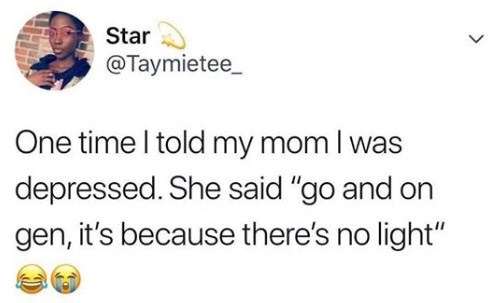 “One time I told my mom I was depressed. She said “go and on gen, it’s because there’s no light” 😂😭”