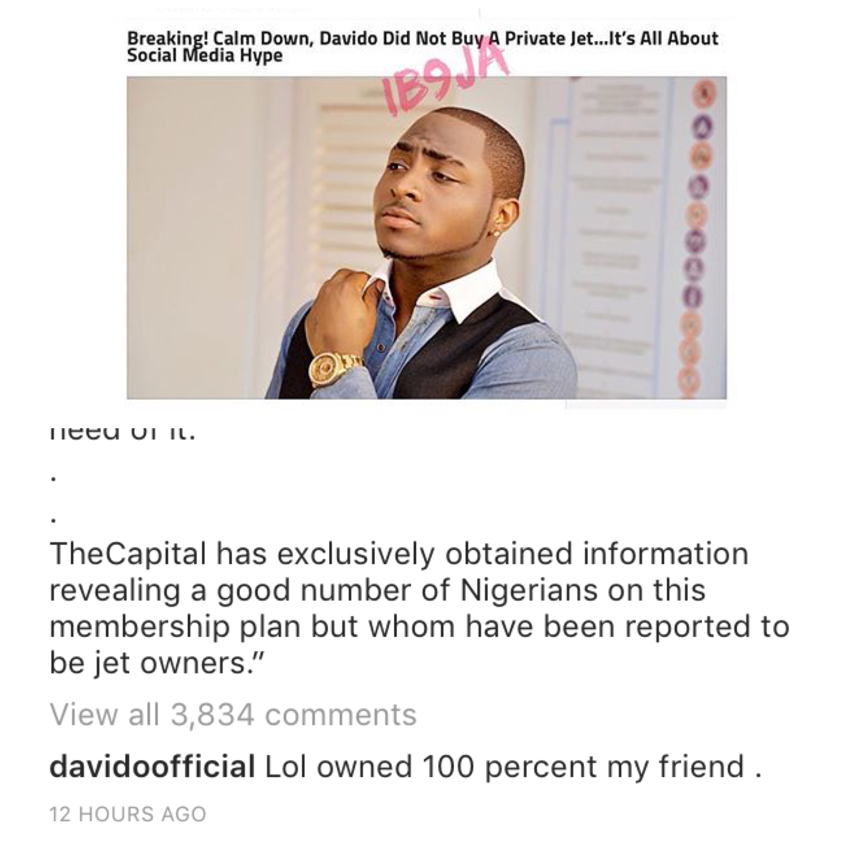 Davido has come out to debunk the story. He dropped a comment on an Instagram news platform, laughing off the story. His comment read;