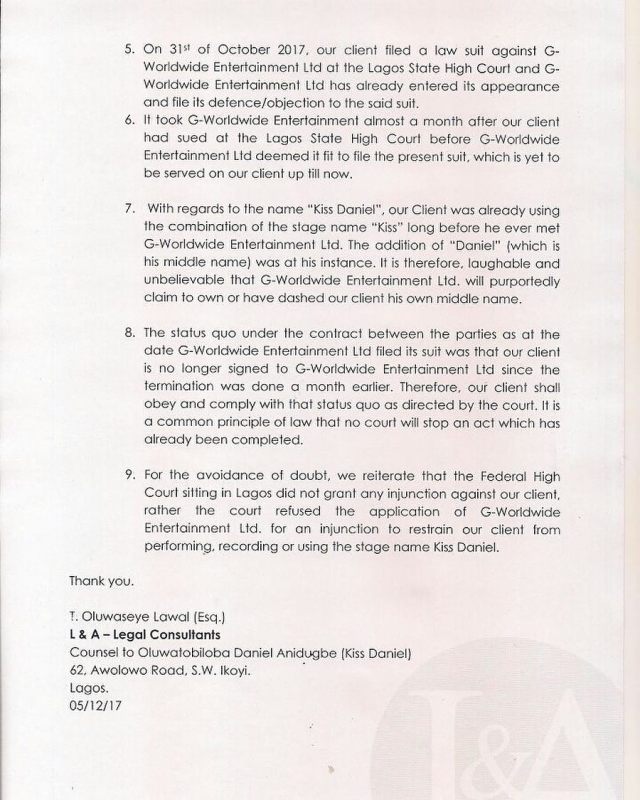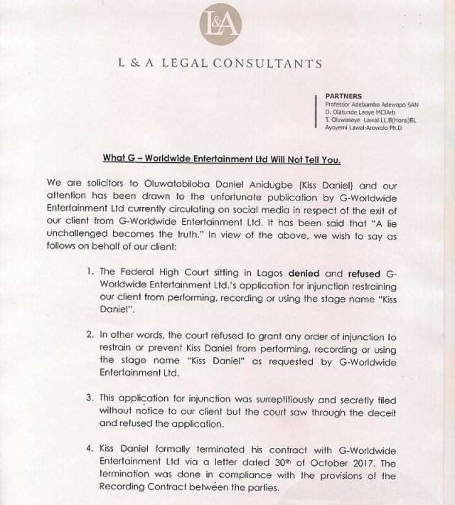 G-worldwide via a statement is suing their former artiste to court for breach of contract.. they’re accusing him of “taking steps to appoint a new manager, solicit for bookings, and has continued to negotiate and enter performance agreements in respect of the songs from the album New Era, and Evolution which is set to be released soon containing singles such as Yeba, For You, Senorita, Sofa and others, produced under the contract, including using the stage name ‘Kiss Daniel’ without the company’s prior consent and permission.”