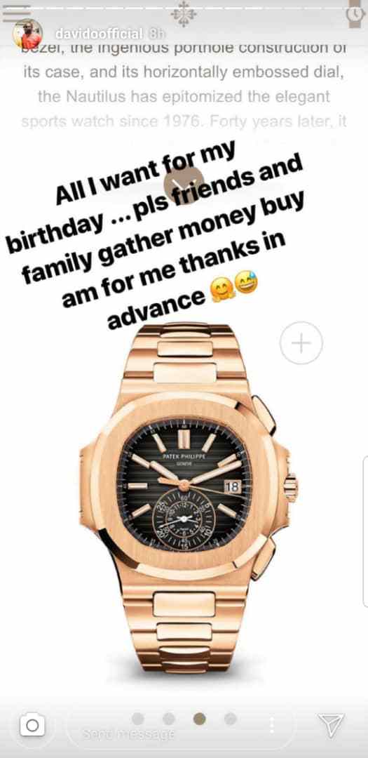 Davido who shared a photo of the $85,000 -a whooping 30m in Naira – Patek Philipe watch via his insta-story, further asked his friends and family to start contributing towards it.