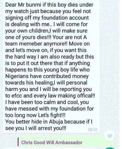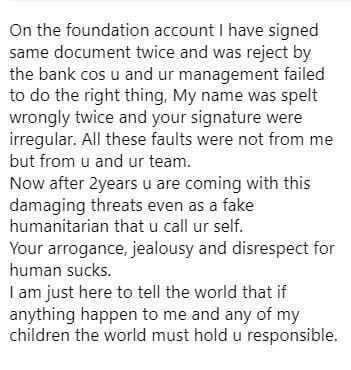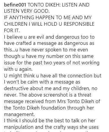 Sharing a screenshot of the threat message from Tonto Dikeh, he wrote, ‘I believe you are evil and dangerous too to have crafted a message as dangerous as this’.