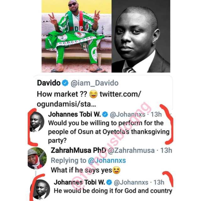 Johannes Tobi is one of the members of President Buhari’s media team, and he’s taunted Davido by asking him to perform at Oyetola’s thanksgiving ceremony.