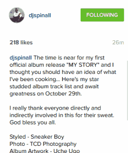 Dj Spinall, also known as The Cap took to Instagram to reveal the track list and album art for his soon-to-be-released debut album, My Story. Date: 2015-10-19 Category: Gist & Gossip Tags: dj spinall