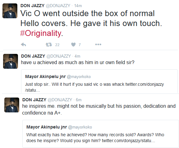 Donjazzy has broguht public praises to Vic O over his new Hello cover.When a fan expressed his pleasure,he said Vic O inspires him because of his confidence .As usual,Vic O is trending again on twitter.