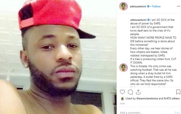 Adesua Etomi who is quite fed up with happenings in the country has called out SARS for killing Kolade Johnson, the man who was shot while watching football yesterday.