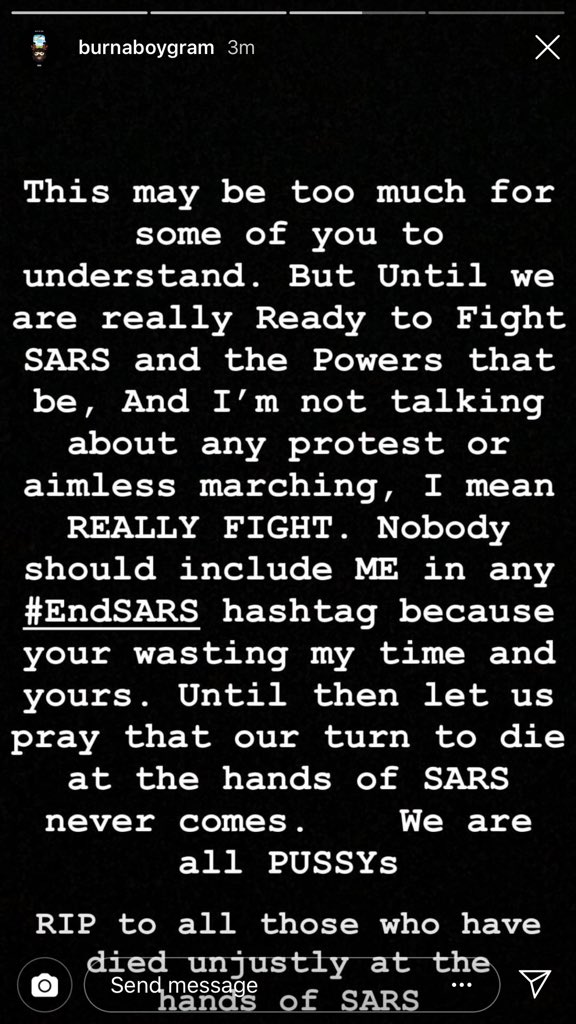 According to Burna, until we are ready to fight SARS and the powers that be, nobody should include him in the hashtag because we are all ‘pussys’.