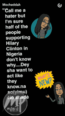 As singer Mocheddah shared via Snapchat.See below Date: 2016-09-27 Category: Gist & Gossip Tags: hillary clinton, mocheddah, nigerians