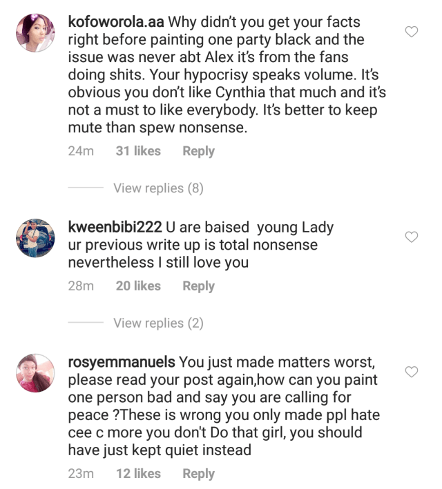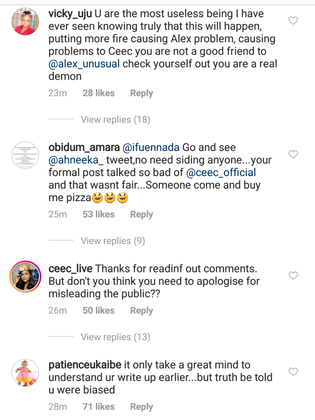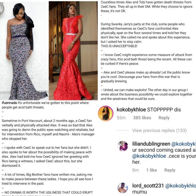 Ifu Ennada came under fire last night after she penned down what she said was a call for peace between fellow ex-housemates, Cee-C and Alex.