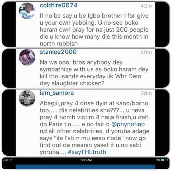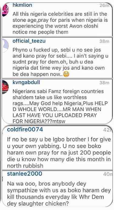 Nigerian rapper, also joined the bandwagon but instead of being given props for the post, he was heavily tongue-lashed for not beginning his charity from his motherland that has been experiencing similar attacks from Boko Haram for some time now.
