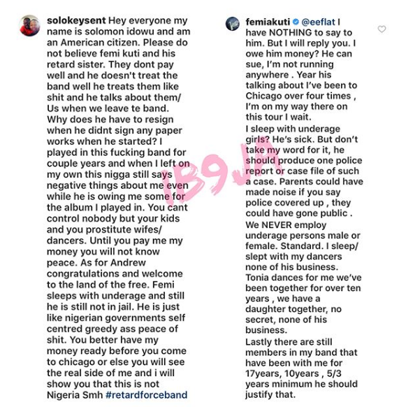 A certain Solomon Idowu who claimed to be Femi Kuti’s former band member responded to the Kuti’s messages o Instagram where he had applauded Andrew for leaving the band since Femi Kuti and his family treats them less than they are. Aside from the fact that he stated that the singer is owing to him, he also accused the singer of sleeping “With underaged and still not in jail”