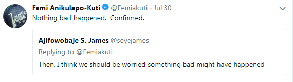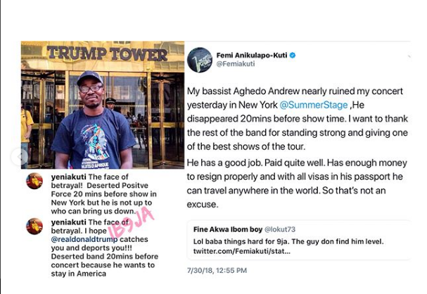 This accusation had come up when the son of legendary Fela tweeted about a member of his band, Aghedo Andrew who disappeared 20 minutes before their show that took place on the 29th of July at Summer Stage, New York. The Bassist according to Femi Kuti’s tweet had left 20 minutes before the show without a word from him and that almost ruined his show which came out successfully eventually. This was followed by his sister, Yeni Kuti’s comment filled with disappointment for the bassist as she asked Donald Trump to find and deport him.