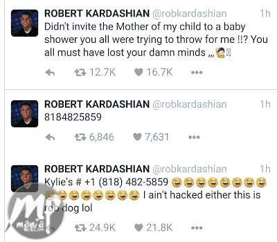 People don’t really know what prompted it but it seems Rob Kardashian is upset that his fiance wasn’t invited to the baby shower being organized for him and for some reason, he took his anger out on Kylie Jenner by posting her phone number on Twitter insisting his account isn’t hacked.