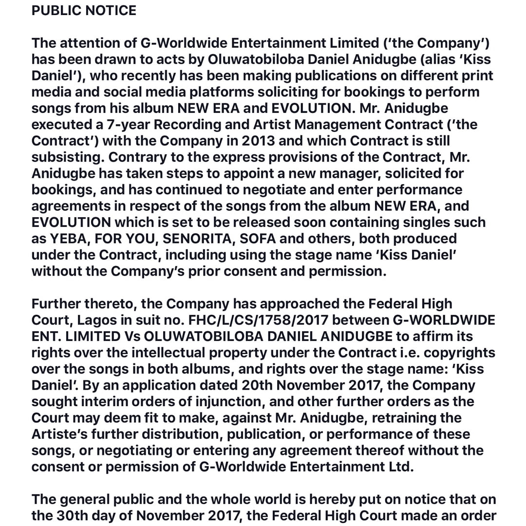 The general public and the whole world is hereby put on notice that on the 30th day of November 2017, the Federal High Court made an order that status quo ante bellum under the Contract, be maintained by the parties, pending the hearing and determination of the motion on notice filed in the suit. The import of the Order being that the state under which the parties existed under the Contract should be preserved until the Court makes a determination of the motion on notice filed by the Company. All and any dealings in respect of the upload, distribution, and or performance of any of the songs, as well as the use or exploitation of the name ‘Kiss Daniel’ can therefore only be entered or made with the prior written consent and permission of the Company as provided under the Contract.The general public and the whole world is further cautioned that as the matter is now before a Court of law (subjudice), and following the Order to maintain status quo, any unauthorized upload, distribution, exploitation, performance, sales, and use of the songs (from the NEW ERA and EVOLUTION albums), or stage name ‘Kiss Daniel’, in any show, event, downloading or streaming platform, will be in violation of the Order of the Federal High Court. Anyone who does or continues to do so shall be liable as an accomplice for contempt of court, and the full weight of the law will be brought against that person as a contemnor.