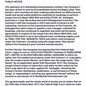The attention of G-Worldwide Entertainment Limited (‘the Company’) has been drawn to acts by Oluwatobiloba Daniel Anidugbe (alias ‘Kiss Daniel’), who recently has been making publications on different print media and social media platforms soliciting for bookings to perform songs from his album NEW ERA and EVOLUTION. Mr. Anidugbe executed a 7-year Recording and Artist Management Contract (’the Contract’) with the Company in 2013 and which Contract is still subsisting. Contrary to the express provisions of the Contract, Mr. Anidugbe has taken steps to appoint a new manager, solicited for bookings, and has continued to negotiate and enter performance agreements in respect of the songs from the album NEW ERA, and EVOLUTION which is set to be released soon containing singles such as YEBA, FOR YOU, SENORITA, SOFA and others, both produced under the Contract, including using the stage name ‘Kiss Daniel’ without the Company’s prior consent and permission.