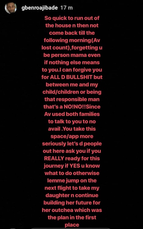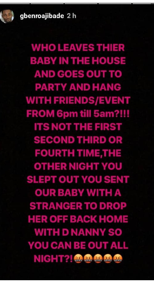 “Who leaves their baby in the house and goes out to party with friends/events from 6 pm to 5 am?!!! It is not the first, second, third and fourth time, the other night you slept out you sent our baby off with a stranger to drop her off at home with the nanny so you can be out all night,” he wrote.