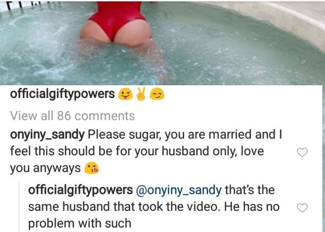 The follower told her that she should cover up now that she’s a mother and a wife. But Gifty replied, saying it was her husband who took the video and he is Ok with her showing off her body.