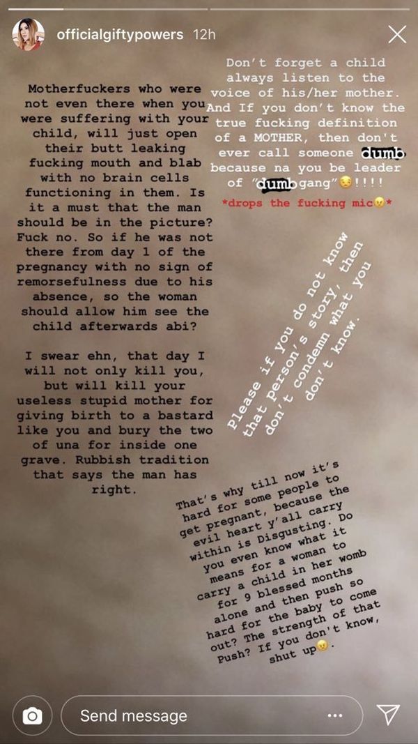In her latest post, Gifty has threatened to kill Mr. 2kay and his mother if they come for her daughter.