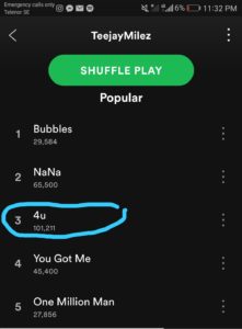 My Single “4u” which is classified as freestyle but took a new turn when more listeners on Spotify and all over the world picked interest which made the song to be featured on spotify weekly discovery playlist.