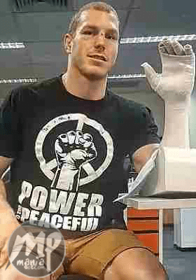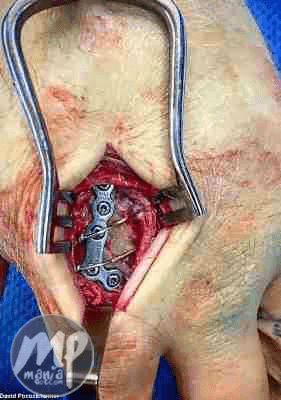 The picture shows PoC0ck’s hand sliced open part way though his operation, a metal device having been inserted to join the broken bones together using screws, plates and wires.