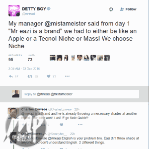 Hear him: “My manager@mistameister said from day 1 “Mr eazi is a brand” we had to either be like an Apple or a Tecno! Niche or Mass! We choose Niche”
